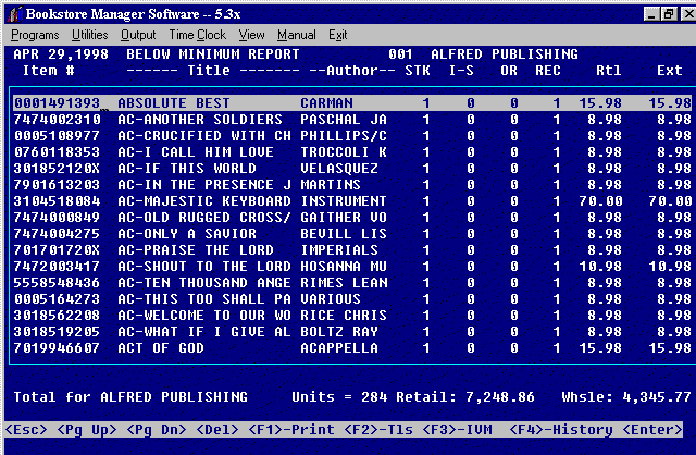 <F2>-Totals - The total units ordered, retail and wholesale value of the needed items are shown. If amounts ordered are changed and/or you delete items, you would need to press <F2> again to re-figure the amounts.