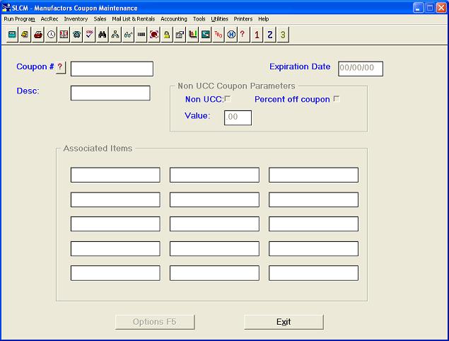 Suppliers such as Chordant are now printing coupons in major magazines, etc. A UCC coupon is a special coupon that has a barcode associated with it. In order for BSMGR to recognize these coupons, they must be entered into your system. Each coupon consists of a "Coupon Number" which is the UCC code that is on the coupon, an optional description, an optional expiration date, and optional associated item numbers. Use the associated item number for validation of coupons that require the purchase of one item in order to get the coupon savings on the second item.